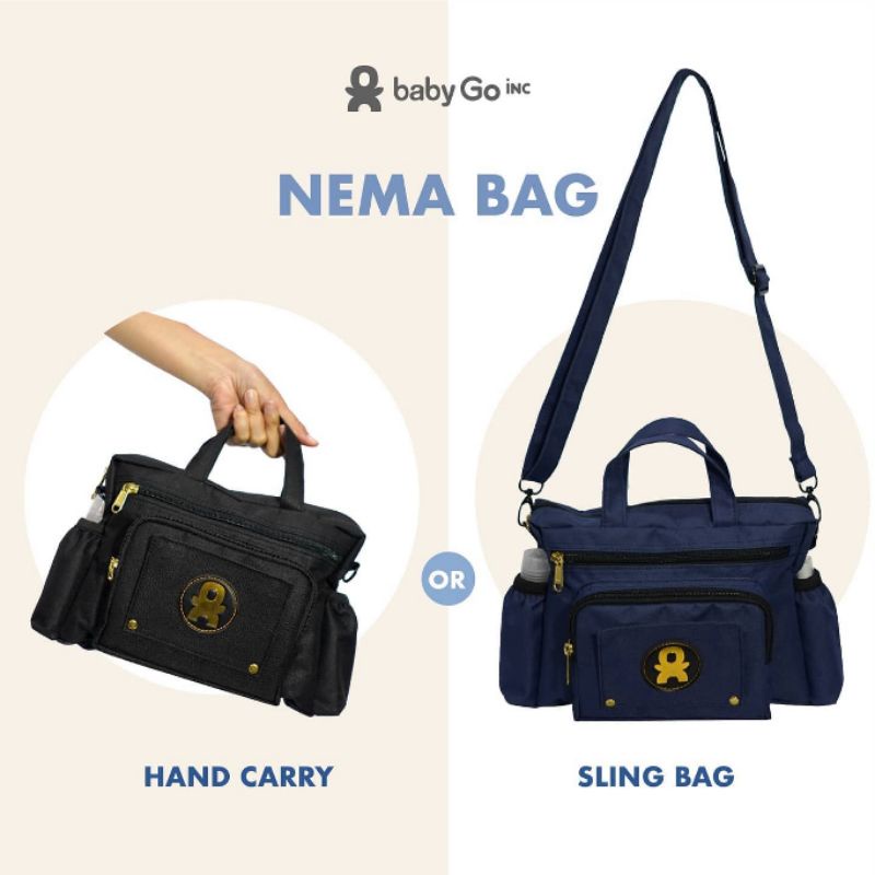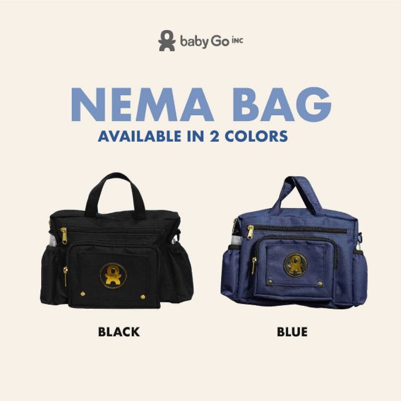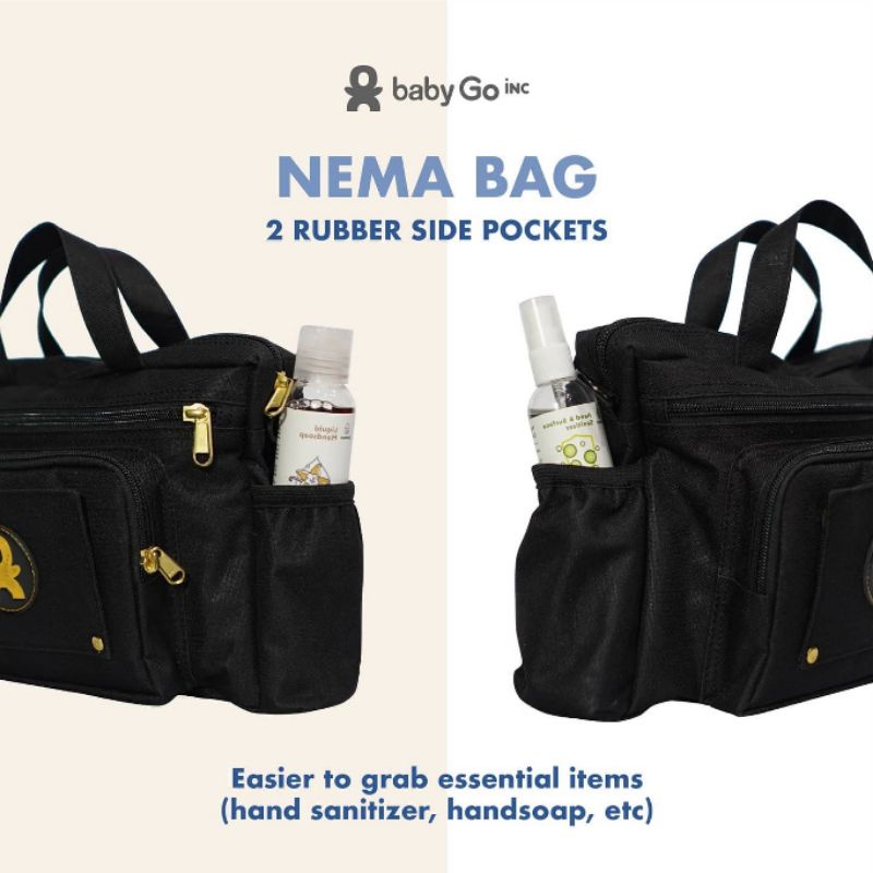 BabyGo Inc Nema Bag / Tas Diaper / Diaper Bag - Rp 185,000 . Nema Bag is designer for bringing new normal essentials, especially when going out with kids With 2 rubber side pockets, mom could easily grab essential items such as hand sanitizer and handsoap. Nema bag is also equipped with easy access to both wet wipes (at front) and dry wipes (at back), and separate compartment at front to store mask, toys, car key or anything else