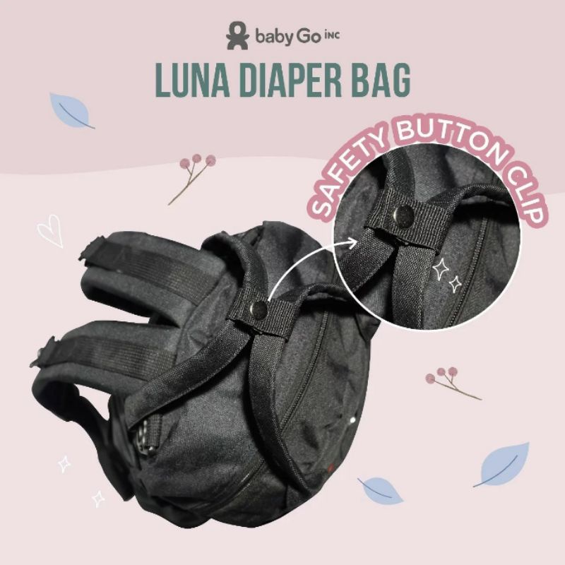 BabyGo Luna Diaper Bag - Rp 365,000 . LUNA Diaper Bag is a medium sized diaper bag per bag with simple, stylish, modern design. This backpack has a total of 11 organizers that will help to organize baby and kid’s stuff. Equipped with 2 pockets in the front to store things that need to be easily grabbed nowadays, such as wet wipes and hand sanitizer. Inside, parents can find 2 rubber pockets, 1 pacifier hook, and 1 net storage. Luna Diaper Bag also have one back separate compartment to store pampers, changing pad, and other diaper needs. When bringing stroller, this backpack can be hung on the stroller using built in stroller hooks attached at the backstraps on this backpack.
