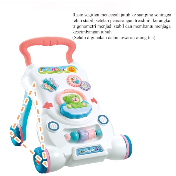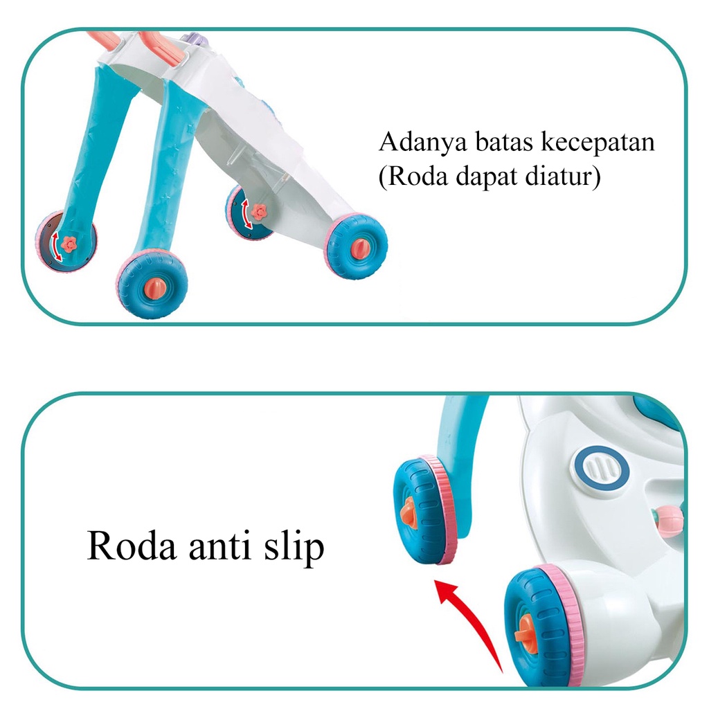Alat bantu jalan menawarkan dua cara untuk bermain: dorong ke lantai + duduk dan bermain. Sekrup yang dapat disesuaikan memungkinkan Anda menyesuaikan kecepatannya sesuai dengan kecepatan bayi belajar berjalan, sehingga bayi bisa belajar berjalan dengan cara yang lebih aman dan ilmiah. Struktur segitiga padat, walker bisa membantu bayi menjaga keseimbangan tubuh sehingga bisa membentuk postur tubuh yang benar.