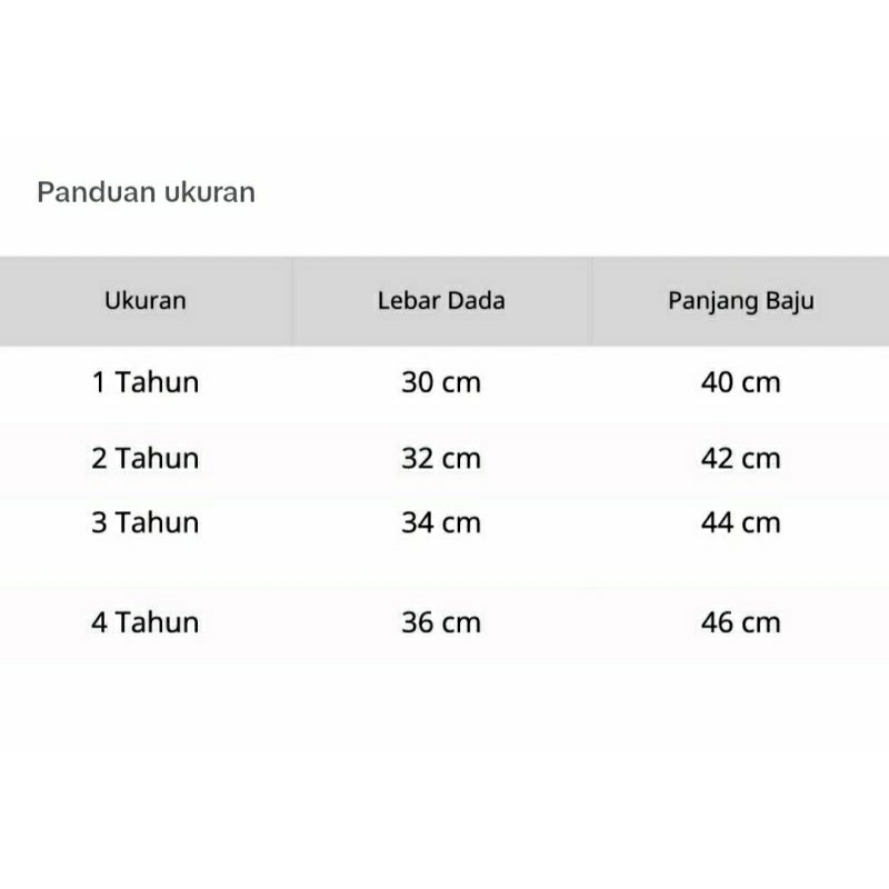 Ukuran : (untuk ukuran/size baju tolong disesuai ke anak moms ya, karena umur tidak bisa dijadikan patokan)