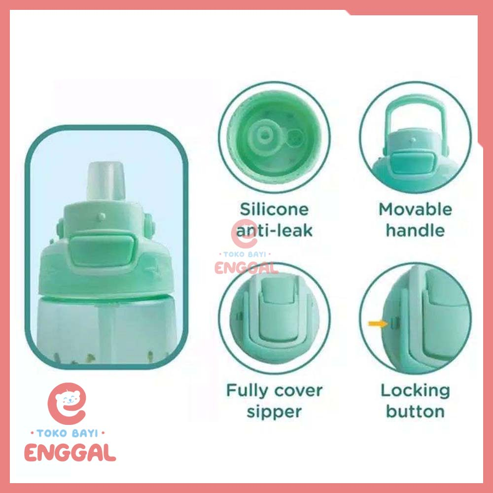 Fitur : - Food Grade Material - Bebas dari Bishpenol - Silicone anti leak Dilengkapi lapisan silikon pada bagian tutupnya agar tidak mudah bocor. - Fully Cover Sipper Cucupannya tertutup rapat bila tidak digunakan. - Locking Button Dilengkapi pengunci, agar cucupan tidak mudah terbuka. - Movable Handle Pegangan dapat dinaik turunkan, sesuai dengan kebutuhan