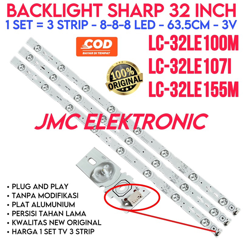 SPESIFIKASI : • HARGA DIATAS 3 BATANG ( 1 SET ) • 8 LAMPU PER BARIS • TEGANGAN 3 VOLT PER LED • PANJANG 63.5 CM • ALMUNIUM PLAT • PLUG AND PLAY • TANPA MODIFIKASI • KUALITAS ORIGINAL • PRESISI, KUAT DAN TAHAN LAMA • JMC ELEKTRONIK PART
