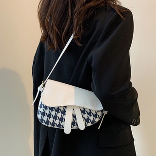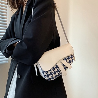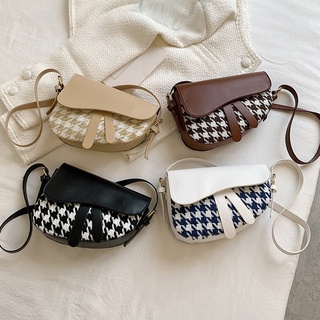 Type: Saddle Bag Material: PU Leather&Woolen Color: Black, White, Khaki, Brown Strap Type: Adjustable Pattern Type: Houndstooth Style: Fashionable