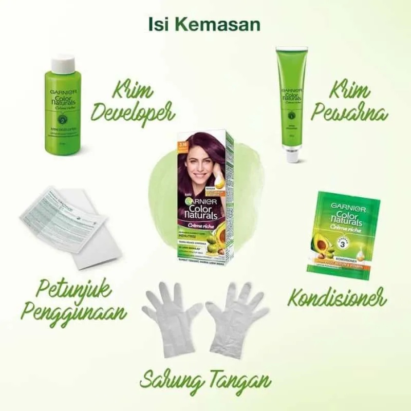 6 Langkah mudah pemakaian Garnier Color Naturals : 1. Pakai sarung tangan 2. Campur krim pewarna dan developer ke dalam mangkuk plastik atau kaca 3. Gunakan campuran pada rambut anda dengan sikat pewarna rambut 4. Biarkan selama 30 menit 5. Bilas rambut anda dengan air hingga bersih 6. Dapatkan rambut yang terasa halus, lembut dan berkilau