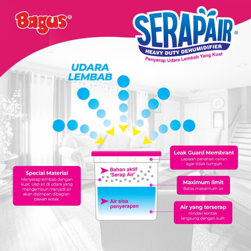 Bagus Serap Air menjawab masalah ini dengan efisien dan dengan harga yang terjangkau. Serap air menyerap kelembaban diudara dan mudah dipakai. Tersedia dalam kemasan sekali pakai dan isi ulang. Kami juga menyediakan varian dengan wewangian dan anti bau (karbon aktif dari arang), dapat dipilih sesuai dengan selera anda.