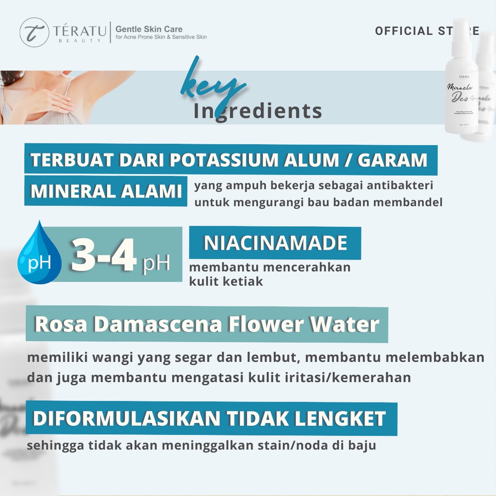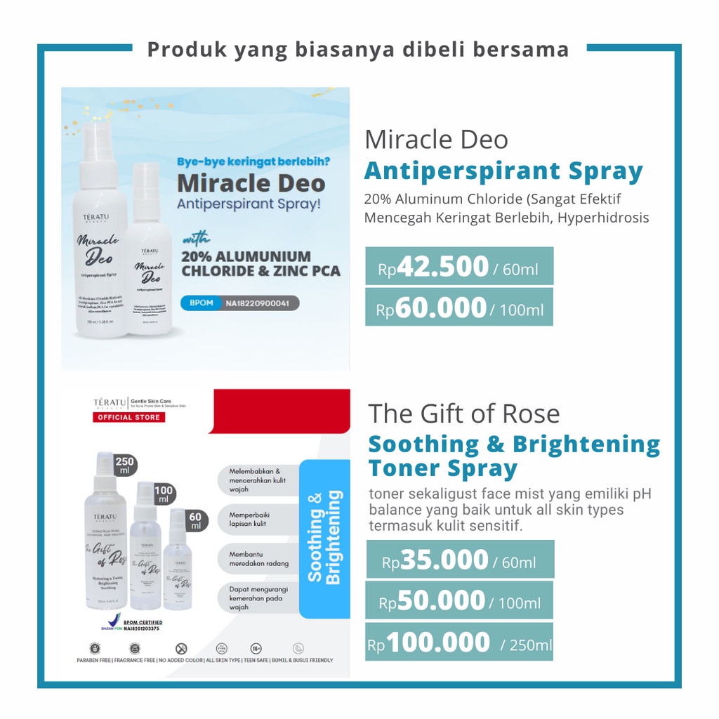 PERHATIAN :. Miracle Deo Spray yang berBPOM ada batasan kadar mineral alum oleh BPOM secara peraturan, maka ada sebagian dari kamu yang merasa kurang efeknya saat menggunakan miracle deo spray. Oleh karena itu, kamu bisa menggunakan Miracle Deo Powder 30gr (dua sendok makan) + Air biasa/ The Gift of Rose 100ml.