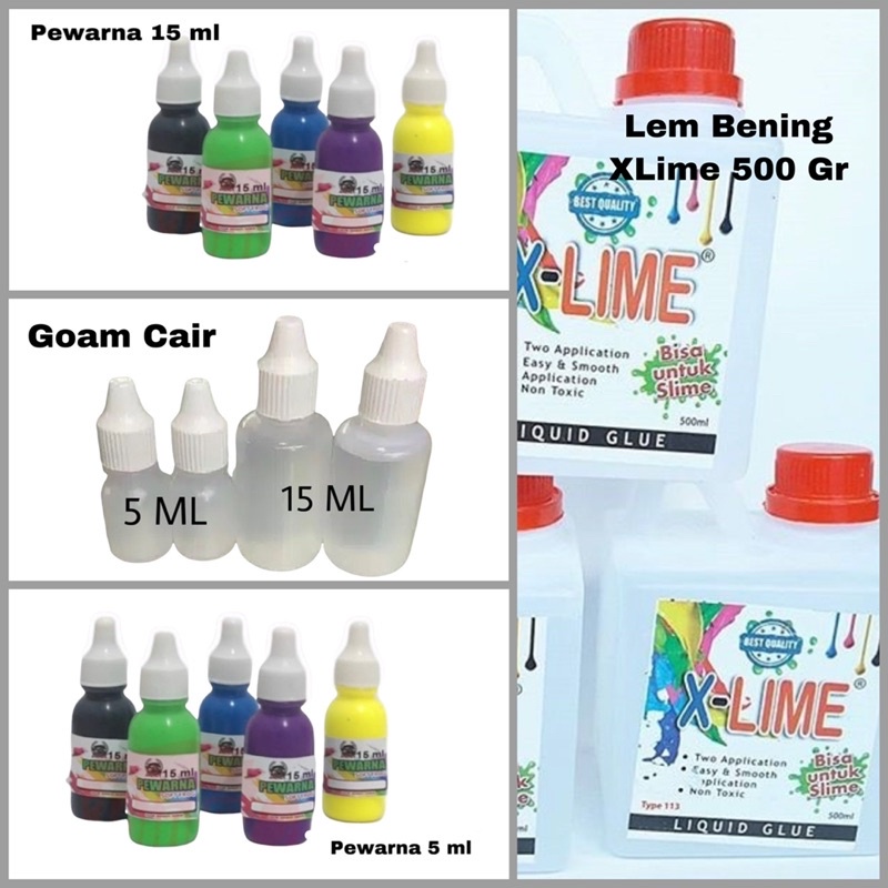 1. Goam, bahan dasar untuk pembuatan slime : uk 5 ml / 15 ml 2. Pewarna Makanan : uk 5 ml 3. Bubuk Gliter : Untuk Pewarna makanan / Glitter, bs pilih No Pink / Random - bs diusahakan di notes di pembayaran bila ingin warna tertentu, tp bila kosong akan dikirimkan random tanpa konfirmasi 4. Lem bening clear XLime : 100 ml / 500 ml