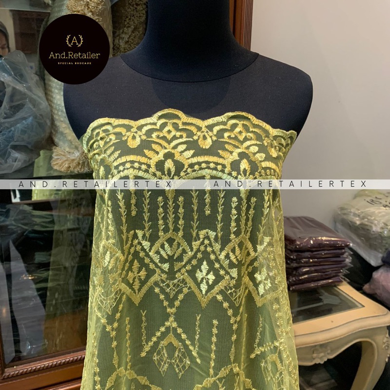 Detail Bahan kain Kebaya Brokat Tile Bordir Etnik Madeline Warna Hijau Lime