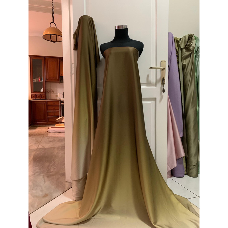 Detail Bahan Kain Satin Silk Armani Gradasi Ombre Gradient 2 Tone Warna Army Olive