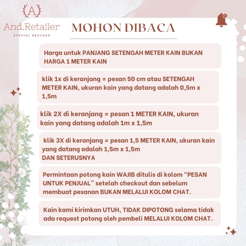 harga yg tertera untuk panjang mulai dari 0.5meter Jika anda ingin membeli panjang 1meter ~ klik 2x pada jumlah keranjang Jika anda ingin membeli panjang 1.5meter ~ klik 3x pada jumlah keranjang Jika anda ingin membeli panjang 2meter ~ klik 4x pada jumlah keranjang Jika anda ingin membeli panjang 2.5meter ~ klik 5x pada jumlah keranjang Jika anda ingin membeli panjang 3meter ~ klik 6x pada jumlah keranjang dst. Lebar kain :1.5meter . Lebar kain tetap tidak berubah yaitu 1,5m . Harga yg tercantum untuk ukuran sisi Panjangnya yah bukan Lebarnya karna sudah standart dari pabrik kalo ukuran Lebarnya. Kain dikirim utuh tanpa dipotong potong, jika ada request minta dipotongin tolong ditulis di NOTE waktu checkout jangan di chat karna belum tentu akan terbaca.