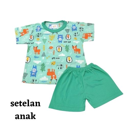 SETELAN ANAK ESTIMASI 1-2 TAHUN BAHAN COTTON VARISI PRINTING LD 30 CM PJ BAJU 35 CM LEBAR PINGGANG 31 CM PJ CELANA : 27 CM