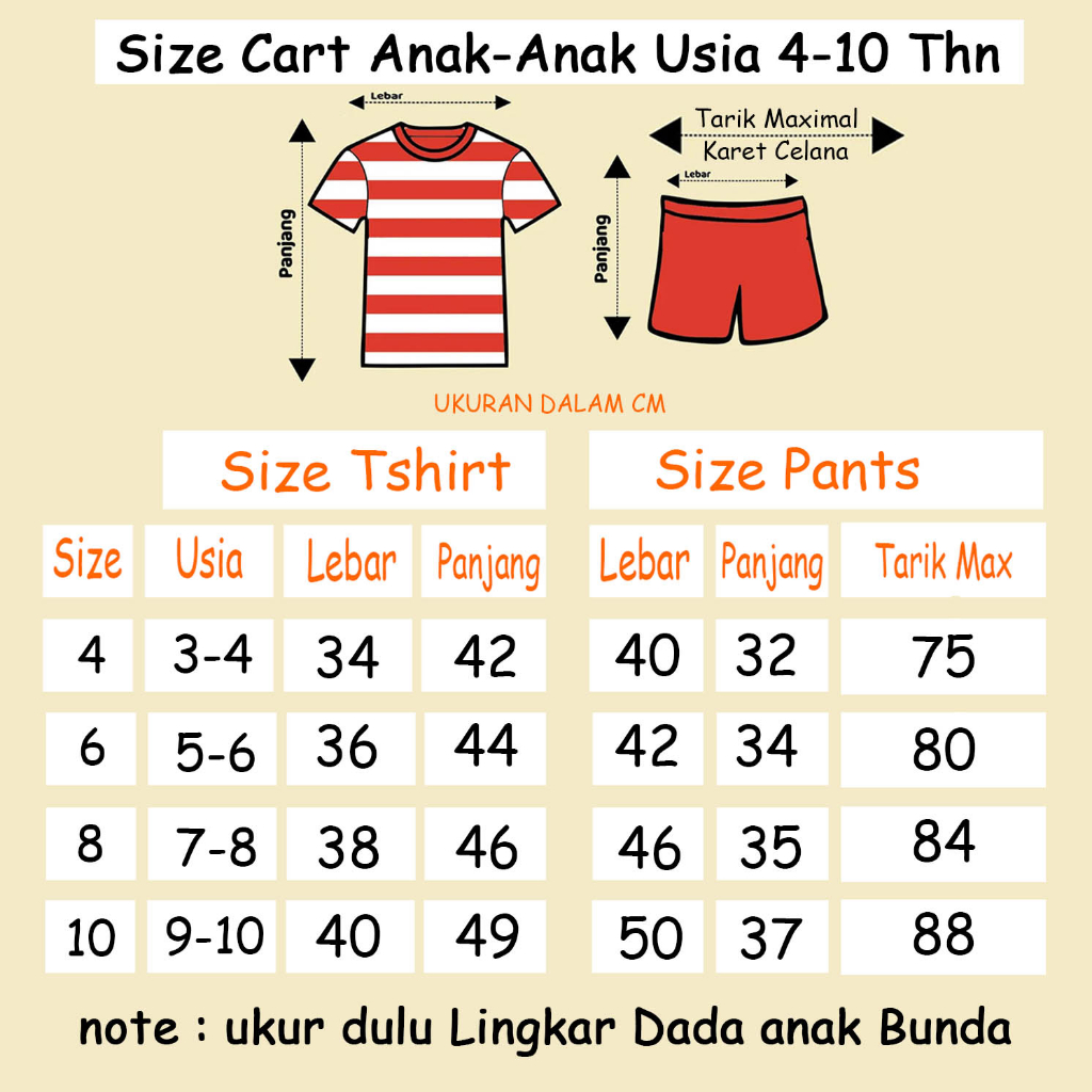 unisex untuk anak laki dan perempuan SIZE CHART : (usia hanya perkiraan UKUR sebelum membeli) tidak terima komplain kekecilan dll bahan kaos Cotton 24s set anak dasar putih dan hitam 1.Ukuran 4 = LD 34 P.Baju 42 cm / Lpinngang 40cm P.Celana 32 (perkiraan usia 3-+ 4 tahun) 2.Ukuran 6 = LD 36 P.Baju 44 cm / Lpinngang 42cm P.Celana 34 (perkiraan usia 5-+ 6 tahun) 3.Ukuran 8 = LD 38 P.Baju 46 cm / Lpinngang 46cm P.Celana 35 (perkiraan usia 7-+ 8 tahun) 4.Ukuran 10 = LD 40 P.Baju 49 cm / Lpinngang 50cm P.Celana 37 (perkiraan usia 9-+ 10 tahun)