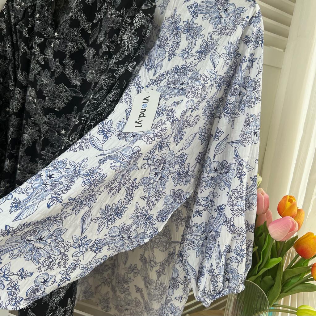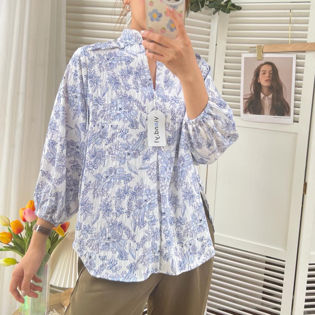 Detail Baju Atasan Basic Wanita V-Neck / Blouse Cewek Korea Motif / Kemeja Bunga Dahlia Oversize Lengan Panjang 123