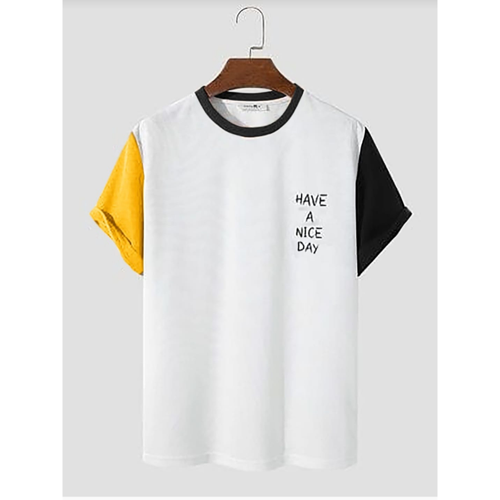 Detail Baju Atasan Kaos Kasual Kombinasi Warna Have A Nice Day Lengan Pendek Pria