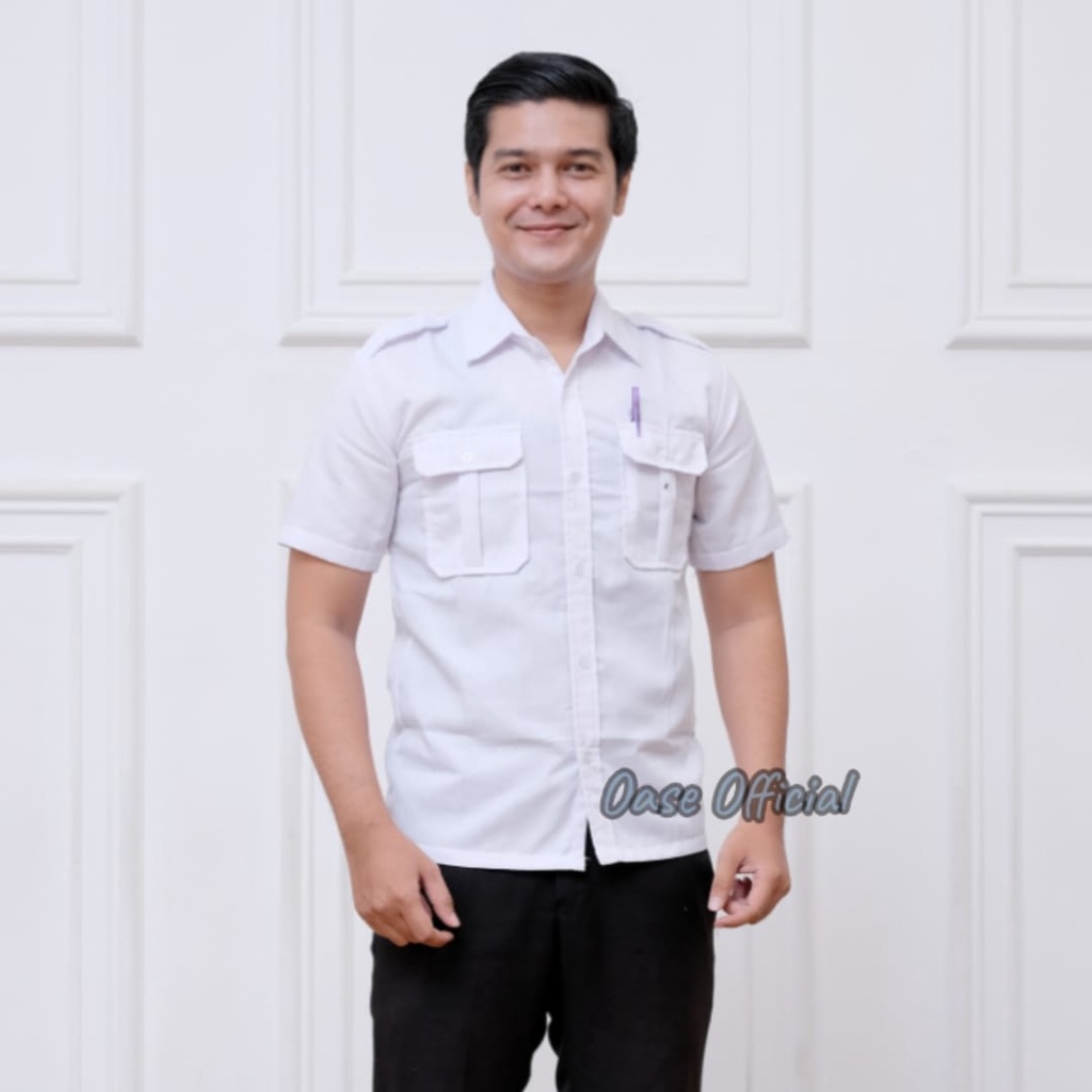 Seragam Kemeja Putih Pria Panjang dan Pendek Bahan Japan Drill warna putih plus jahitan Rapi dan kuat 2 saku tutup lengan pendek dan panjang ukuran mulai dari S sampai 3XL