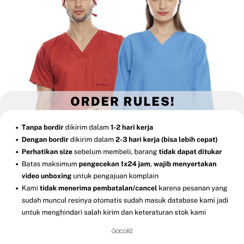 Set Lengkap : 1. Baju Scrub terdapat 3 saku tempel, 1 saku dada tingkat, 2 saku tempel di bagian bawah, full resleting samping seperti gambar 2. Celana Panjang dengan karet pada pinggang, 2 kantung samping atas kanan kiri 3. Masker 4. Cap/Penutup kepala