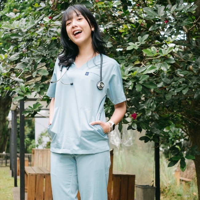 Detail Baju Jaga V NECK SS - 2nd Birthday LIMITED EDITION Scrubs Theatre Blues Cardinal Lengan Pendek Celana Slim Fit