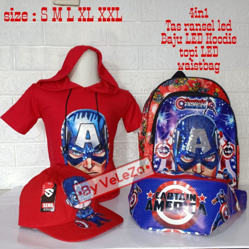 Detail Baju kaos led hoodie anak karakter kapten amerika 4in1 - tas led + baju led + topi led + waistbag - baju anak