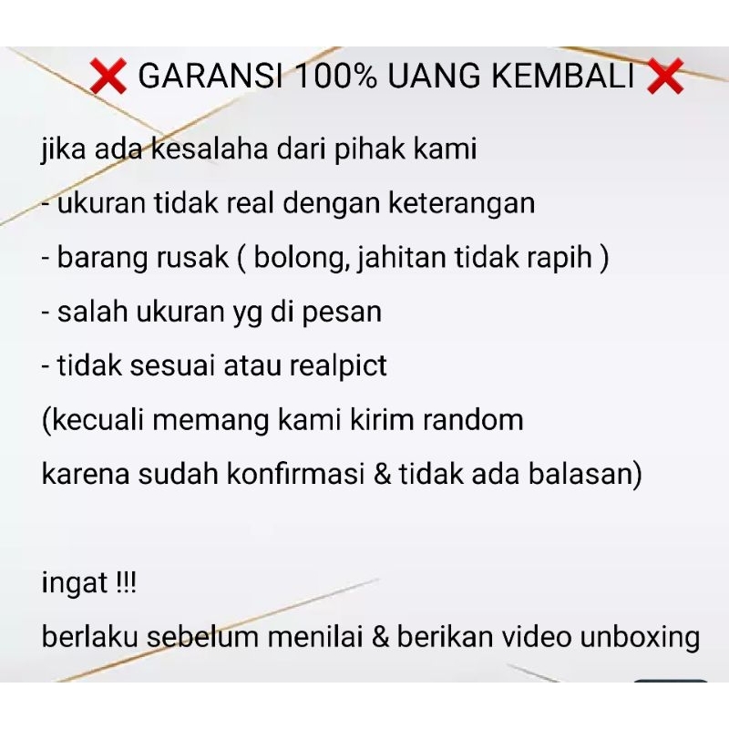 ❌ GARANSI 100% UANG DAN BARANG KEMBALI jika ada kesalahan dari pihak kami seperti Salah motif, salah size, ukuran tidak REAL Ingat jika ada kesalahan jangan langsung beri penilaian tetapi chat kami terlebih dahulu !
