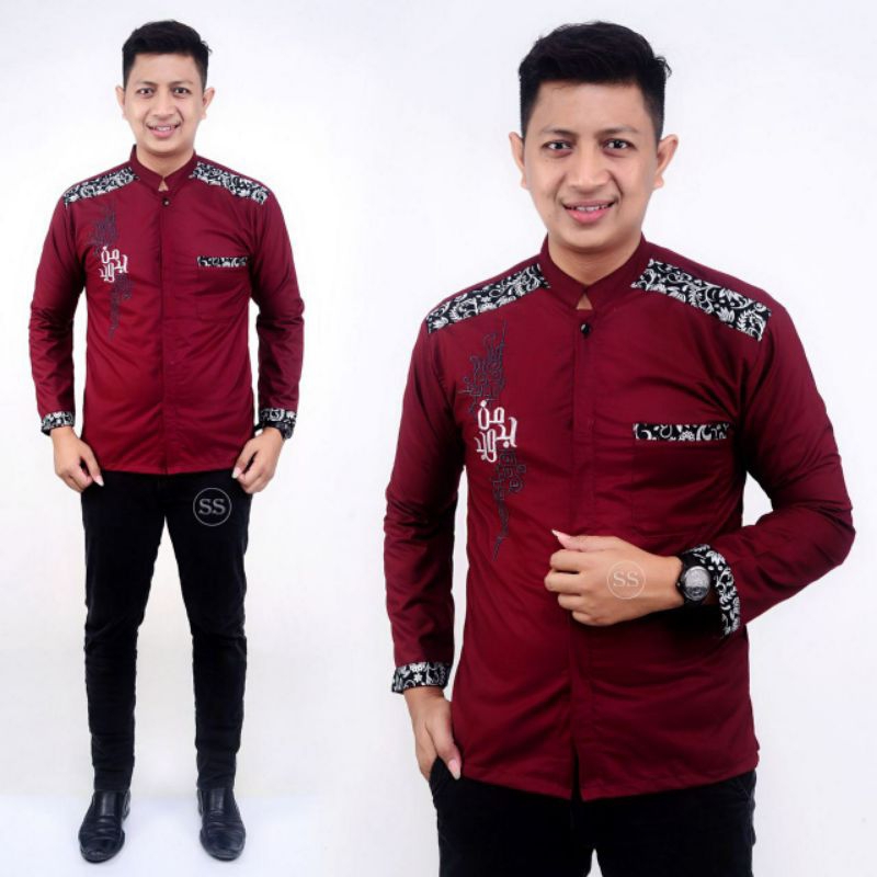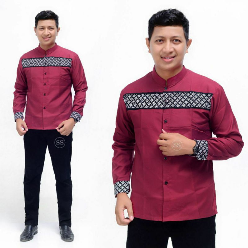 Detail BAJU KOKO PRIA BORDIR KOMBINASI KEMEJA BATIK PRIA POLOS WARNA MERAH MARUN LENGAN PANJANG