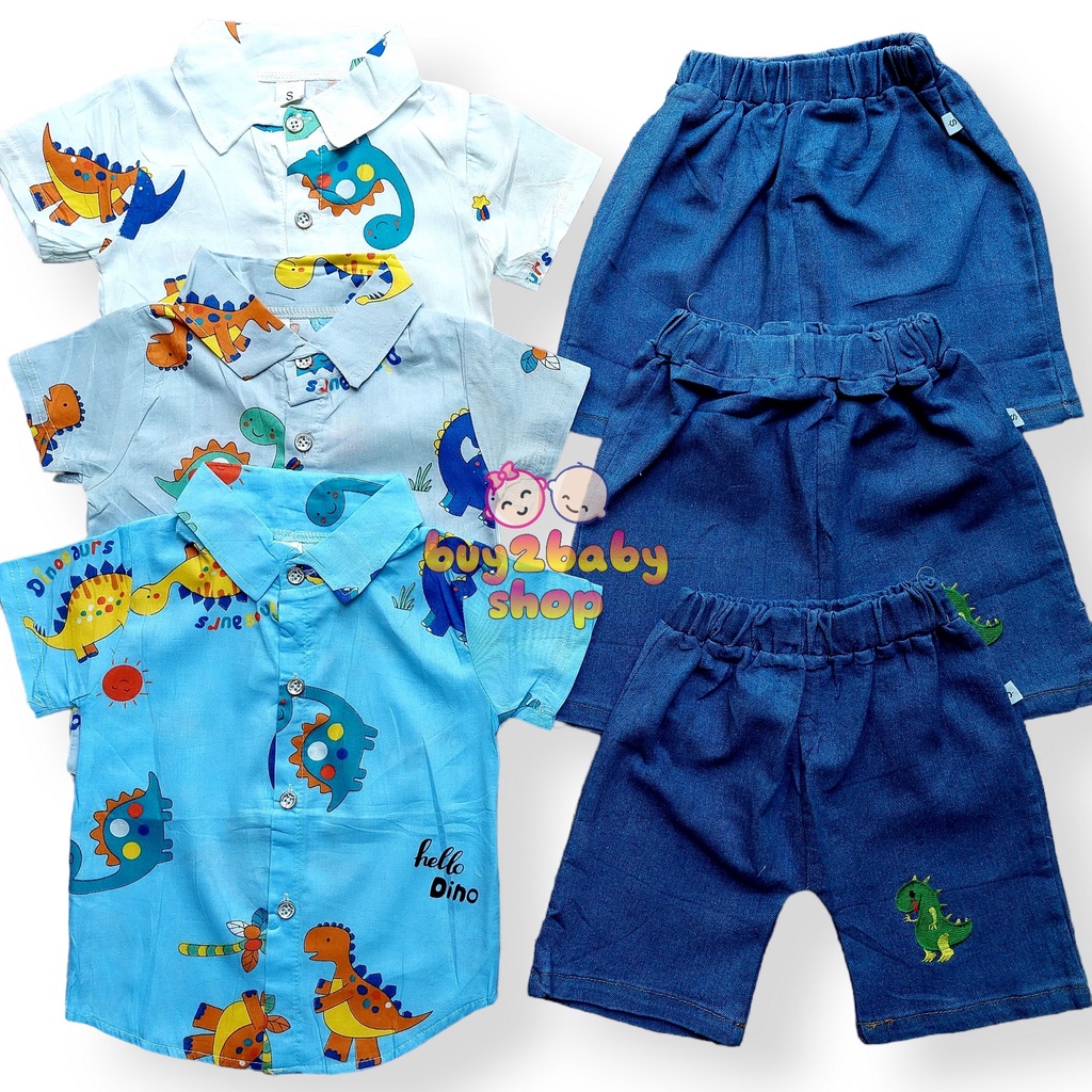 Baju lebaran anak setelan kemeja celana pendek bahan katun denim dino series usia 1-3 tahun