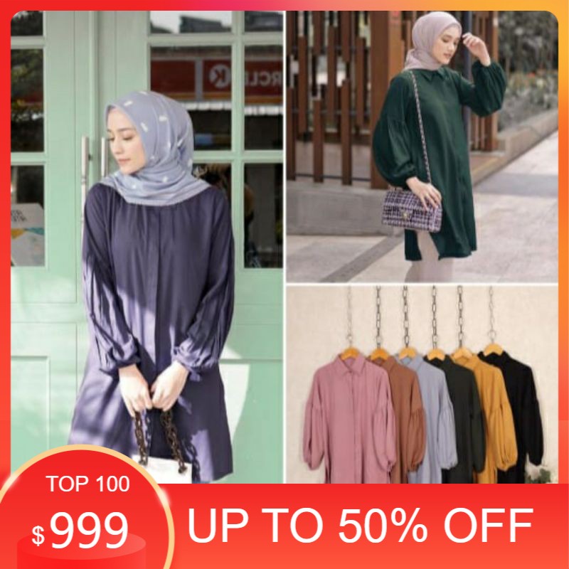 Detail Baju Long Dress Tunik Wanita Muslim Jumbo Polos Tangan Balon Terbaru Kekinian Polos