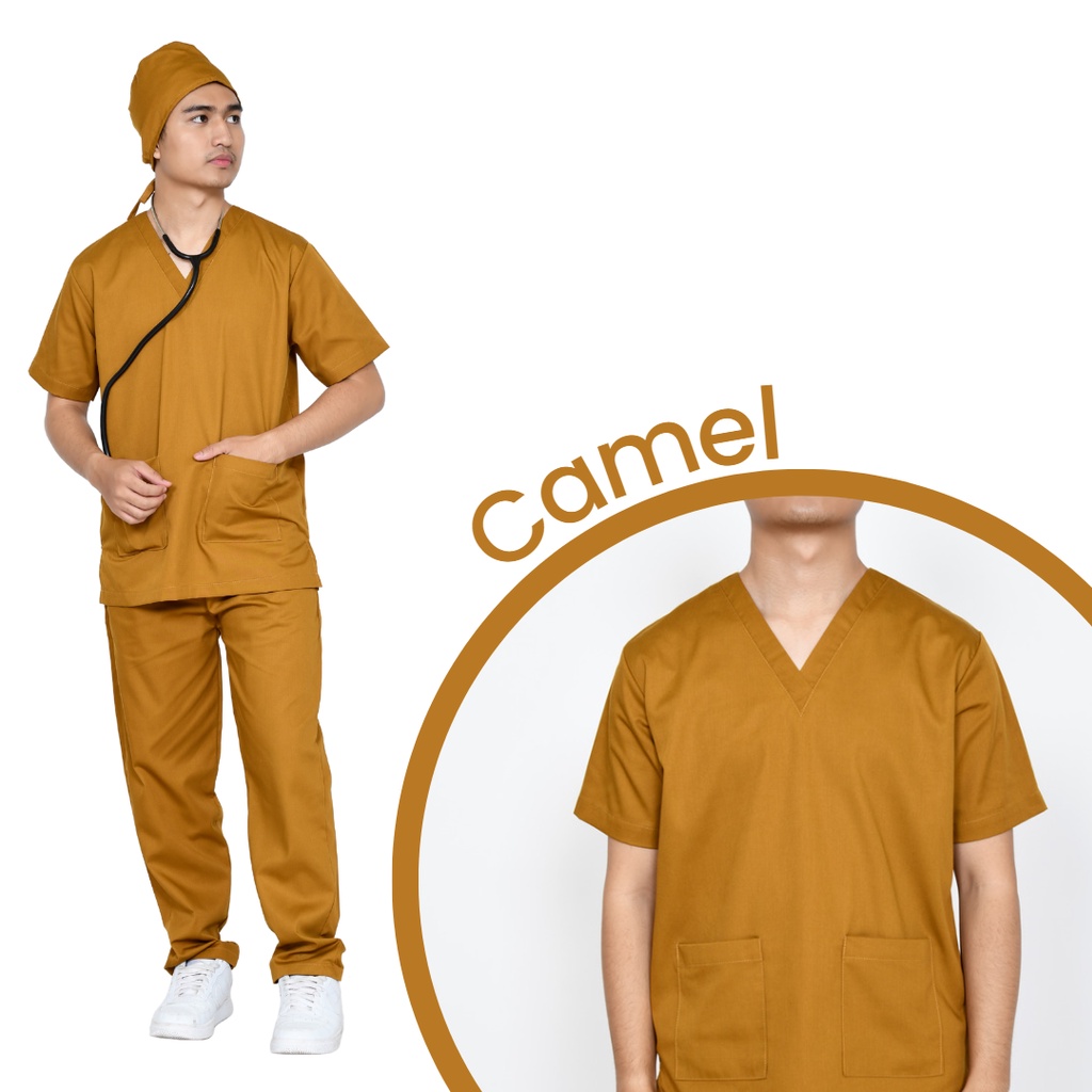 Detail: • Kerah V- neck • Saku 2 buah di atasan • Saku 2 buah di celana • Include topi dan masker kain