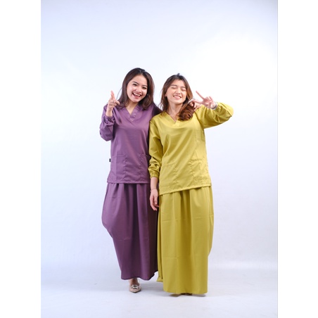Kelengkapan 1 Set baju OKA ROK terdiri dari: - Atasan: terdapat 2 saku dibagian bawah, lengan panjang karet dan kerah V neck - ROK Panjang: terdapat saku sebelah kanan rok, dan di bagian pinggang full karet elastik - Masker - Head Cap