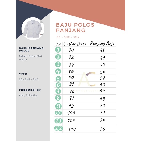 BAJU PUTIH POLOS PANJANG GS (OXFORD) Bahan : Oxford Sariwarna - Kain terasa halus - Tekstur rata dan rapih - Tidak terasa panas - Tidak transparan dan tidak menerawang. - Cocok untuk digunakan wilayah tropis. Model : Kemeja Seragam sekolah - Lengan panjang - Lengan berkancing - Non Logo - Jahitan rapih Detail Size : LD (Lingkar dada) / PB (Panjang Baju) No. 1 = LD 70 PB 48 No. 2 = LD 72 PB 49 No. 3 = LD 75 PB 50 No. 4 = LD 78 PB 53 No. 5 = LD 81 PB 56 No. 6 = LD 85 PB 59 No. 7 = LD 90 PB 63 No. 8 = LD 94 PB 65 Keterangan : Kelas 1 estimasi No. 1 / 2 Kelas 2 estimasi No. 2 / 3 Kelas 3 estimasi No. 3 / 4 Kelas 4 estimasi No. 4 / 5 Kelas 5 estimasi No. 5 / 6 Kelas 6 estimasi No. 6 / 7 Untuk No. 7 / 8 termasuk ukuran jumbo ya Bund ^^ *note : size diatas merupakan estimasi standar seragam, untuk ukuran tidak terpatok pada usia, sesuaikan dengan tinggi badan dan berat badan atau sesuaikan dengan ukuran yang telah di sediakan.