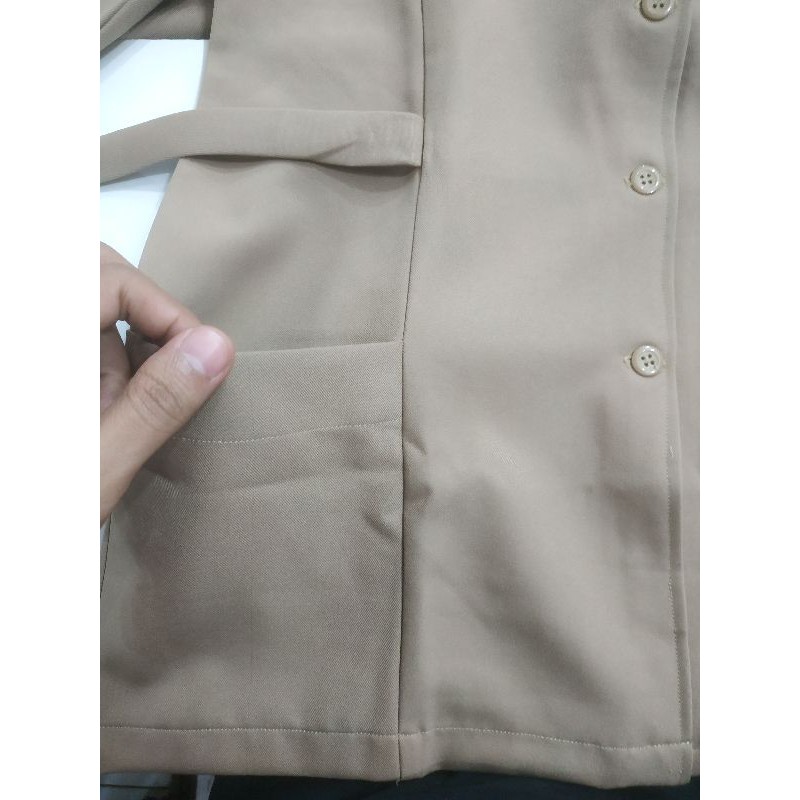 Bahan : Rapilo Detail Bahan : Lembut, Tebal, Tidak Mudah Kusut, Tekstur Halus, Nyaman Digunakan Warna : Coklat Kopi Susu Model : - Baju Jas Wanita - Pakai Tali Belakang - 2 Kantong Kiri Kanan Bawah Jahitan : Rapi dan Kuat Badge : Bordir Foto: Real Pic