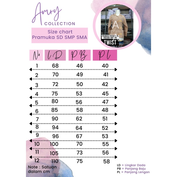 BAJU PRAMUKA TALI PEREMPUAN (OXFORD) Bahan : Oxford Sariwarna - Kain terasa halus - Tekstur rata dan rapih - Tidak terasa panas - Tidak transparan dan tidak menerawang. - Cocok untuk digunakan wilayah tropis. Model : Kemeja Seragam sekolah - Lengan Polos non kancing - Logo Pramuka menggunakan bedge bordil - Jahitan rapih Detail Size : LD (Lingkar dada) / PB (Panjang Baju) No. 1 = LD 70 PB 45 No. 2 = LD 72 PB 50 No. 3 = LD 74 PB 52 No. 4 = LD 76 PB 54 No. 5 = LD 80 PB 57 No. 6 = LD 85 PB 59 No. 7 = LD 90 PB 62 No. 8 = LD 95 PB 66 No. 9 = LD 98 PB 68 No. 10 = LD 105 PB 72 No. 11 = LD 107 PB 75 No. 12 = LD 110 PB 79