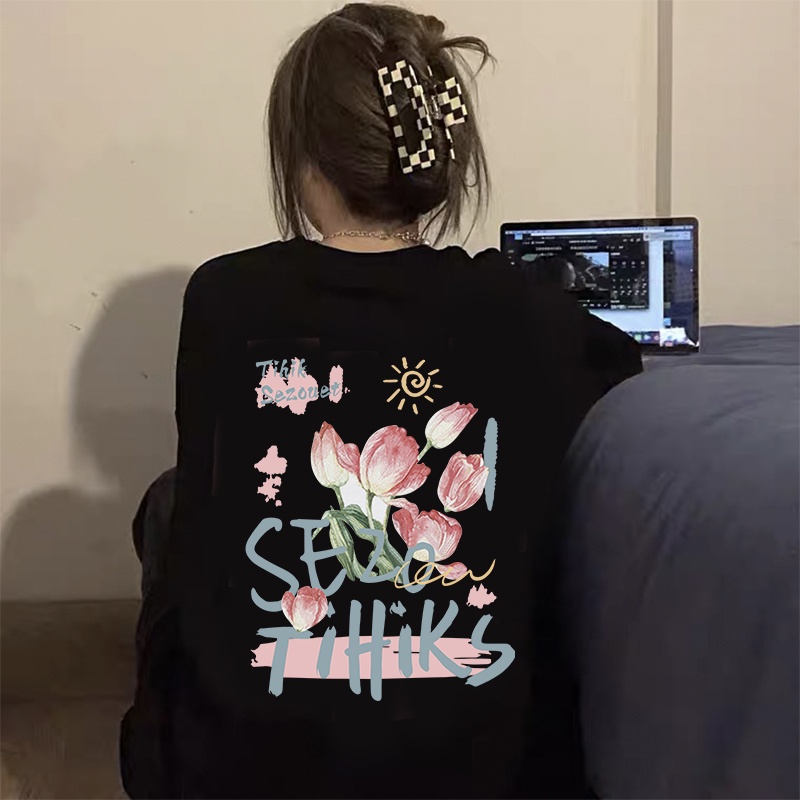 Detail baju sweater wanita retro lengan panjang rose letter graphic printing crewneck kekinian sweater hitam