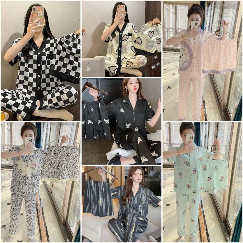 Detail Baju tidur wanita stelan kancing 3in1 import