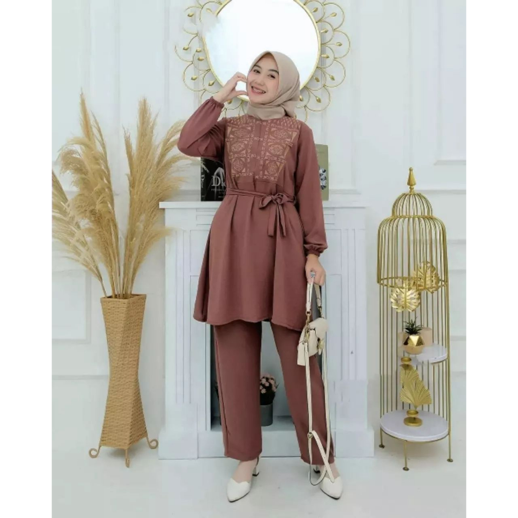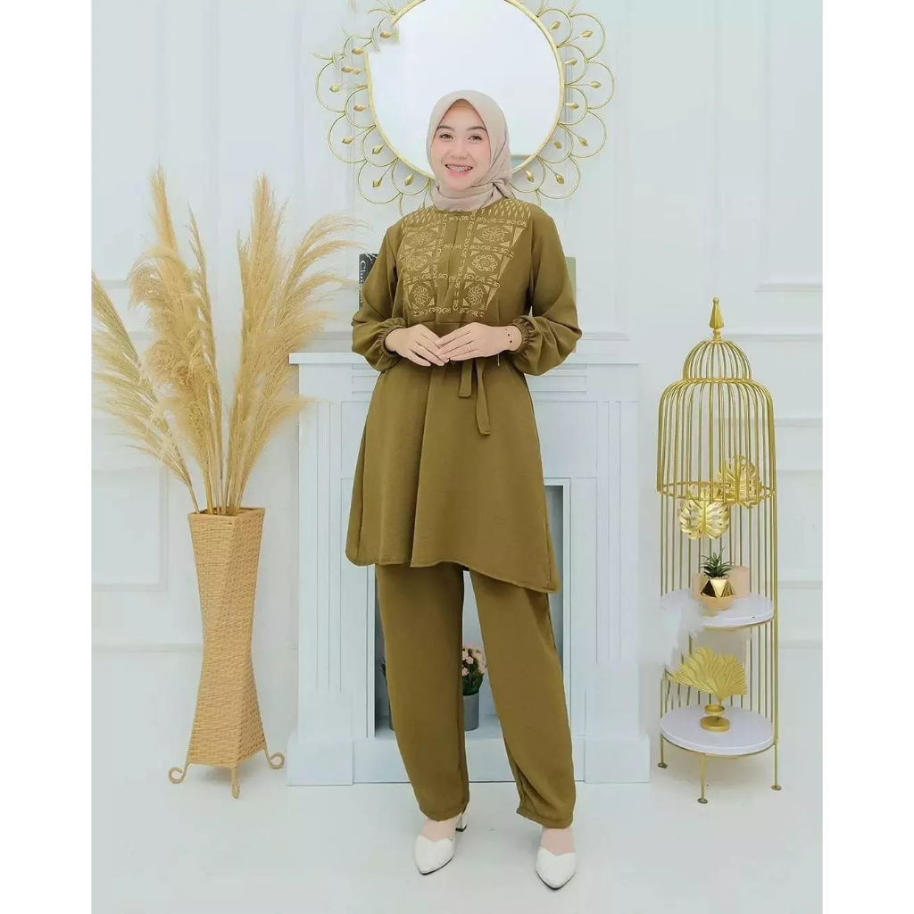 🔸Detai Produk - Nama : Nadya Set - Bahan : Crinkle - Motip : Polos - Model : Setelan Celana - Aplikasi bordir - Ziper depan busui - Ikat pinggang terpisah