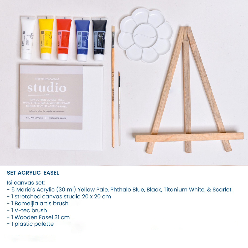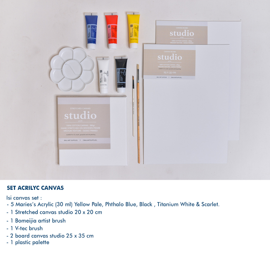 Isi canvas set: - 5 Marie's Acrylic (30 ml) Yellow Pale, Phthalo Blue, Black, Titanium White, & Scarlet. - 1 stretched canvas studio 20 x 20 cm - 2 Canvas Board Studio ukuran 25 x 35 cm - 1 Bomeijia artis brush - 1 V-tec brush - 1 plastic palette