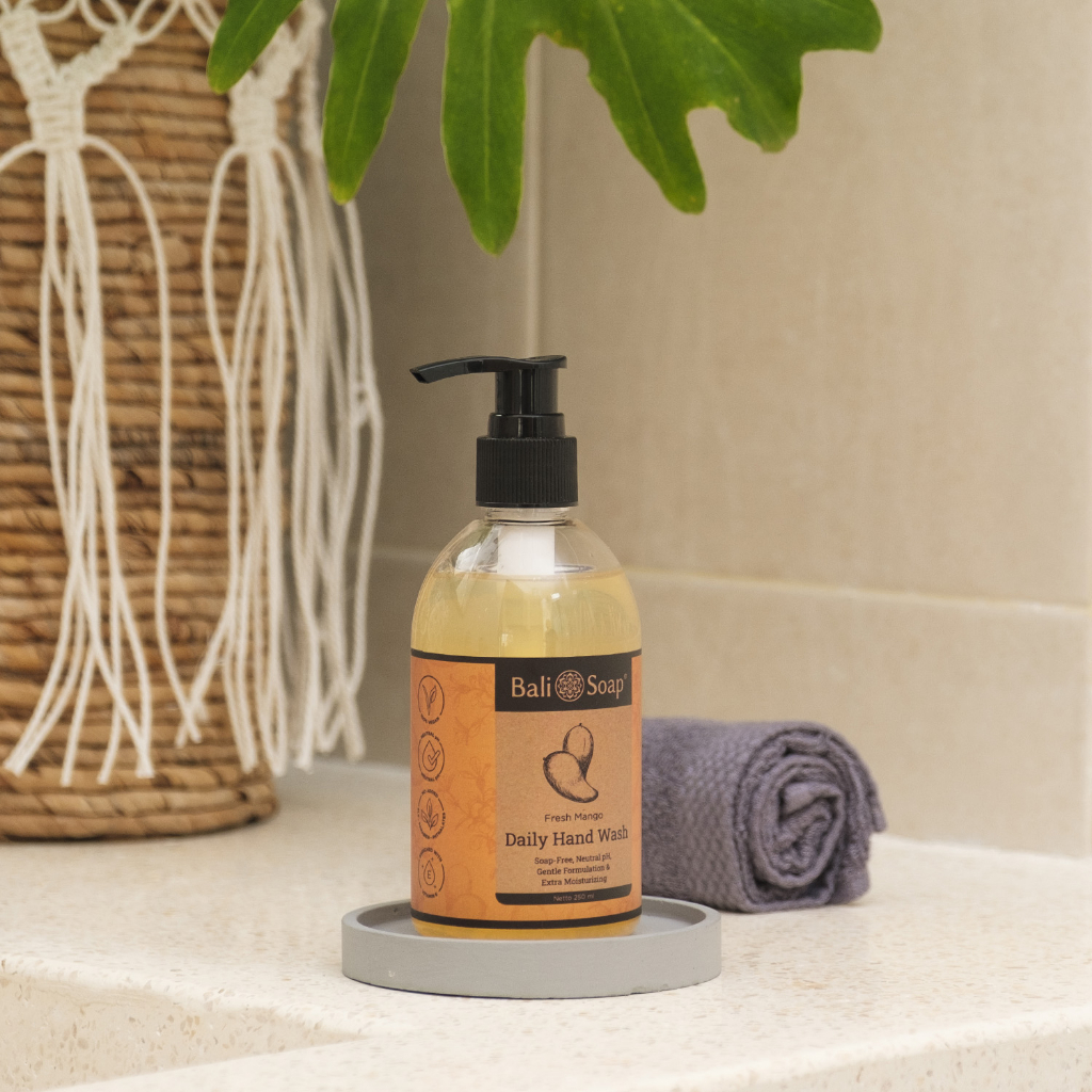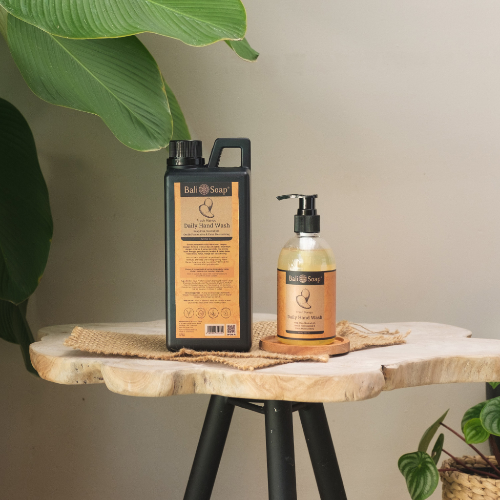 Bali Soap - Fresh Mango Daily Hand Wash, Gentle Formulation & Extra Moisturizing, 250ml & 1L Product Description: Cocok untuk mencuci tangan kamu sehari-hari. Hand wash dengan formula yang lembut dan ph netral, aman dipakai untuk sekeluarga. Dibuat dengan Gliserin Tumbuhan (Vegetable Glycerin) untuk menjaga kelembaban alami kulit, juga diperkaya dengan Vitamin E yang menutrisi kulit, serta aroma Fresh Mango yang mewah, lembut & tahan lama. Tersedia juga ukuran isi ulang 1L yang lebih ekonomis untuk sekeluarga. Isi netto: 250ml / 1L No BPOM: 18230700108 Jenis Kulit: Semua jenis kulit, termasuk kulit yang sensitif sekalipun. Product Highlight: Vegetable Glycerin: Menjaga kelembaban alami kulit. Tocopherol (Vit E): Berfungsi sebagai nutrisi untuk kulit dan berperan sebagai antioksidan. Membantu menjaga keremajaan dan kesehatan kulit. Non-phthalates premium fragrance: aroma mewah, tidak mengandung zat kimia phthalates yang berbahaya yang biasanya ada dalam fragrance biasa. Semua produk sudah tersertifikasi BPOM & Halal. Aman untuk digunakan sehari-hari. Hanya menggunakan minyak tumbuh2an yang sudah tersertifikasi oleh RSPO. Cocok untuk pengikut gaya hidup vegan. Tidak pernah diuji cobakan ke hewan. Produk biodegradable, dapat terurai dengan mudah dan tidak merusak ekosistem.