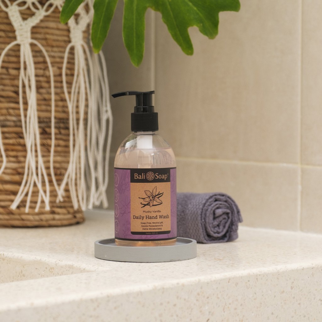 Bali Soap - Musky Vanilla Daily Hand Wash, Gentle Formulation & Extra Moisturizing, 250ml & 1L Product Description: Cocok untuk mencuci tangan kamu sehari-hari. Hand wash dengan formula yang lembut dan ph netral, aman dipakai untuk sekeluarga. Dibuat dengan Gliserin Tumbuhan (Vegetable Glycerin) untuk menjaga kelembaban alami kulit, juga diperkaya dengan Vitamin E yang menutrisi kulit, serta aroma Musky Vanilla yang mewah, lembut & tahan lama. Kulit terasa halus,wangi dan tidak kering. Tersedia juga ukuran isi ulang 1L yang lebih ekonomis untuk sekeluarga. Isi netto: 250ml / 1L No BPOM: 18230700109 Jenis Kulit: Semua jenis kulit, termasuk kulit yang sensitif sekalipun. Product Highlight: Vegetable Glycerin: Menjaga kelembaban alami kulit. Tocopherol (Vit E): Berfungsi sebagai nutrisi untuk kulit dan berperan sebagai antioksidan. Membantu menjaga keremajaan dan kesehatan kulit. Non-phthalates premium fragrance: aroma mewah, tidak mengandung zat kimia phthalates yang berbahaya yang biasanya ada dalam fragrance biasa. Semua produk sudah tersertifikasi BPOM & Halal. Aman untuk digunakan sehari-hari. Hanya menggunakan minyak tumbuh2an yang sudah tersertifikasi oleh RSPO. Cocok untuk pengikut gaya hidup vegan. Tidak pernah diuji cobakan ke hewan. Produk biodegradable, dapat terurai dengan mudah dan tidak merusak ekosistem.