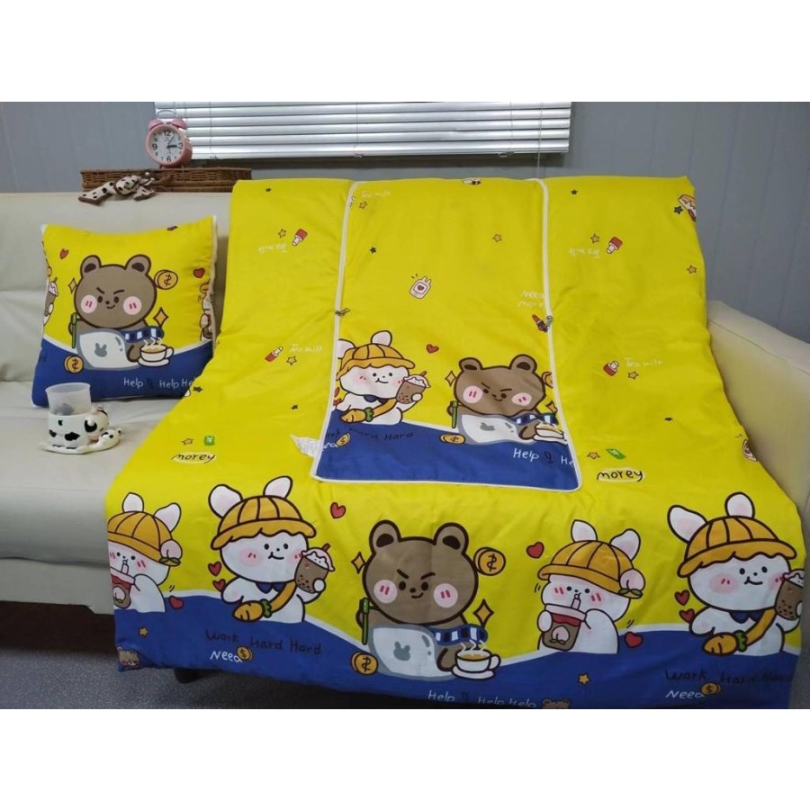 Dilipat jadi bantal, Dibentangkan jadi selimut. Ada resleting untuk menutup lipatan sehingga berbentuk seperti bantal, bisa dipakai untuk bantal sofa dan bantal mobil