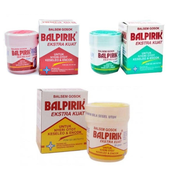 Balpirik dapat membantu meredakan keseleo, encok, pegel linu dan nyeri otot, serta dapat digunakan untuk mengatasi rasa pusing, mabuk perjalanan, pilek, gatal karena gigitan serangga dan masuk angin Komposisi Oleum cayuputi 10 %, Oleum Eucalypti 4 %, Oleum Miristicae 1 %, Terpentine 2 %, Menthol 0,5 %, Vaselin Album ad 100 % Dosis Sesuai kebutuhan Aturan Pakai Dioleskan pada bagian tubuh yang diinginkan, dapat diulangi seperlunyaBalpirik Merah Balsem Gosok Extra Kuat digunakan untuk nyeri otot dan keseleo