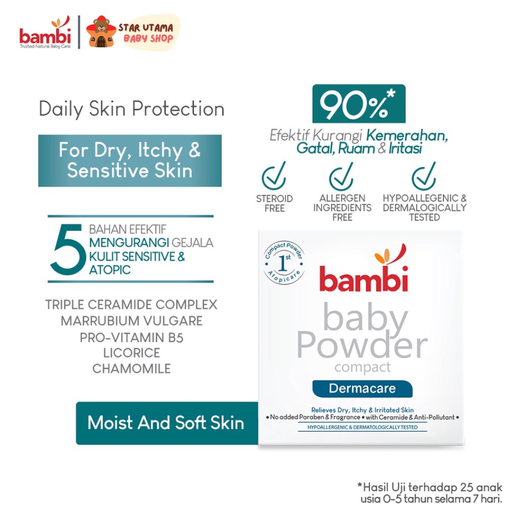 Bambi Baby Compact Powder Dermacare diformulasikan secara khusus dengan Ceramide untuk memperkuat fungsi pelindung kulit bayi yang mampu melindungi kulit kering, gatal, dan iritasi. Mengandung ekstrak tumbuhan Marrubium vulgare sebagai anti polutan untuk membantu mekanisme pertahanan kulit dan melindungi kulit dari polutan yang dapat memperburuk kondisi kulit. Marrubium Vulgare juga membantu menenangkan kulit yang meradang karena hipersensitivitas bawaan atau paparan alergen tertentu seperti cuaca dingin dan kering, tungau, debu rumah, bulu hewan peliharaan, ftalat, dan pengawet. Diperkaya dengan Anti Irritant Complex (Pro vitamin B5, Licorice, dan Chamomile Oil) untuk menjaga kelembapan dan kelembutan kulit bayi.