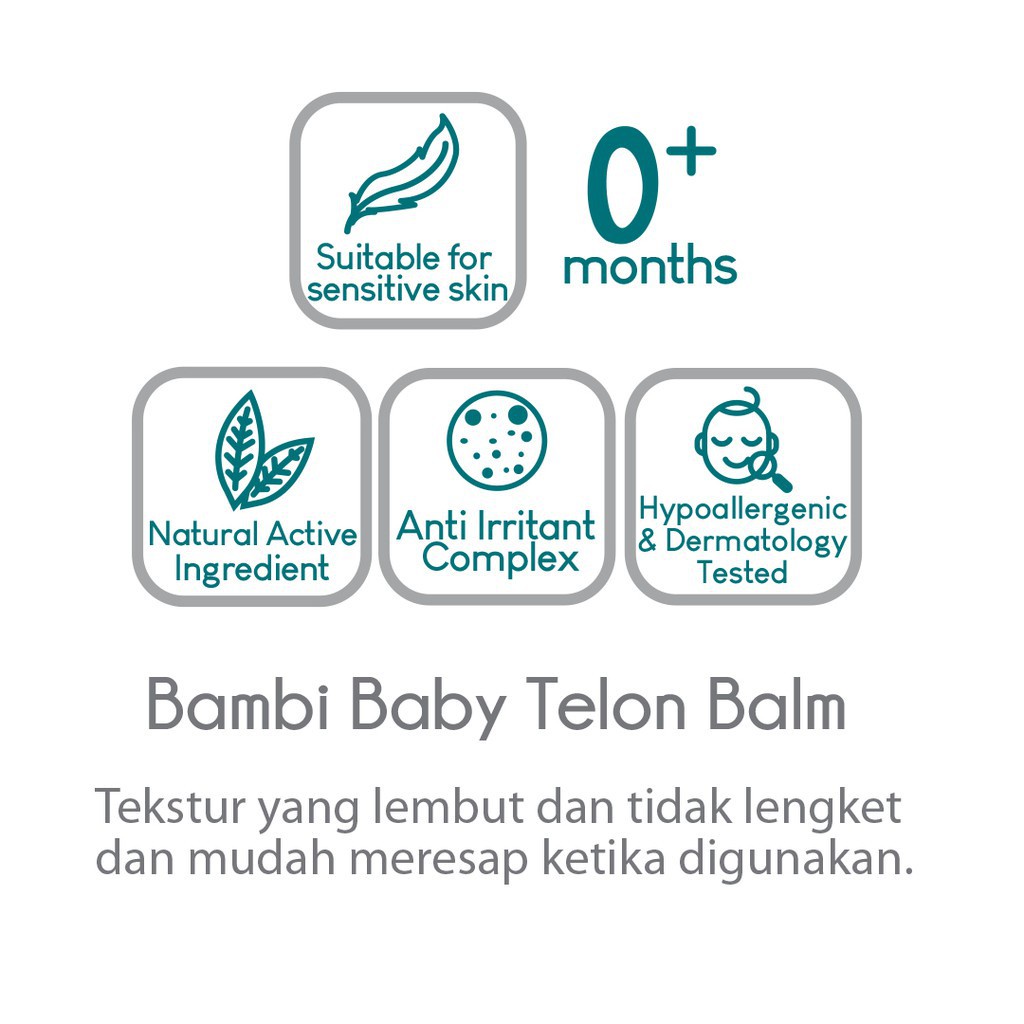 Bambi Telon diformulasikan dari bahan-bahan alami untuk membantu meringankan perut kembung, masuk angin, dan untuk memberikan rasa hangat pada tubuh bayi Anda. Bambi Telon juga melembutkan dan membantu melindungi kulit bayi Anda.