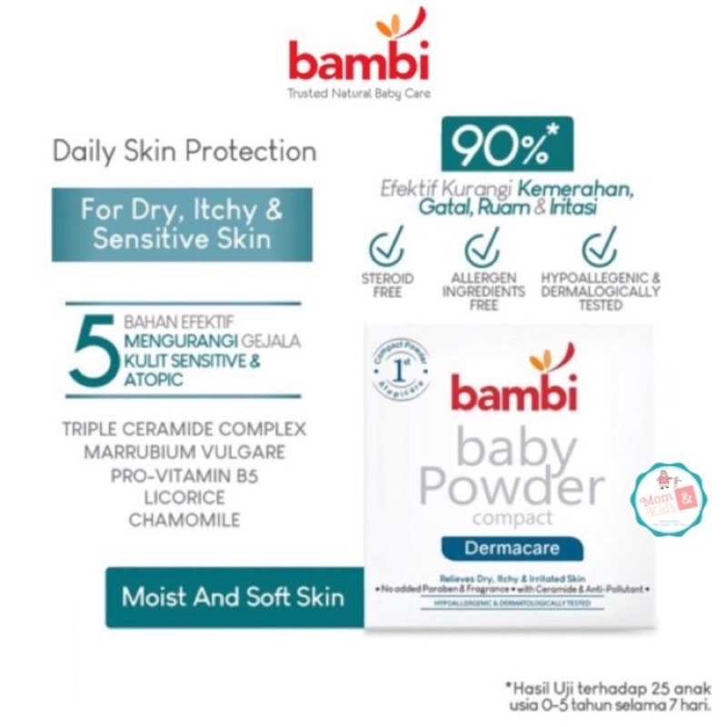 Bambi Baby Compact Powder Dermacare diformulasikan secara khusus dengan Ceramide untuk memperkuat fungsi pelindung kulit bayi yang mampu melindungi kulit kering, gatal, dan iritasi. Mengandung ekstrak tumbuhan Marrubium vulgare sebagai anti polutan untuk membantu mekanisme pertahanan kulit dan melindungi kulit dari polutan yang dapat memperburuk kondisi kulit. Marrubium Vulgare juga membantu menenangkan kulit yang meradang karena hipersensitivitas bawaan atau paparan alergen tertentu seperti cuaca dingin dan kering, tungau, debu rumah, bulu hewan peliharaan, ftalat, dan pengawet. Diperkaya dengan Anti Irritant Complex (Pro vitamin B5, Licorice, dan Chamomile Oil) untuk menjaga kelembapan dan kelembutan kulit bayi.