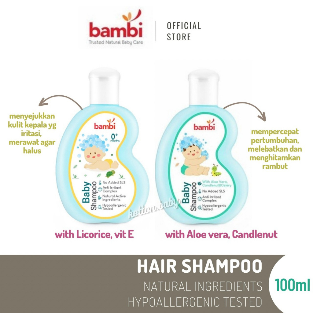 • Bambi Baby Shampoo diformulasikan secara khusus dari Aloe vera yang terbukti dapat membantu untuk mempercepat pertumbuhan rambut. Candlenut atau kemiri merupakan bahan alami untuk memperkuat akar rambut dan juga untuk menebalkan rambut. Dilengkapi dengan Celery (seledri) yang dipercaya untuk mecegah kerusakan rambut serta menebalkan rambut. Kombinasi dari ke tiga bahan ini secara efektif dapat menebalkan, merangsang pertumbuhan rambut juga menyehatkan rambut.