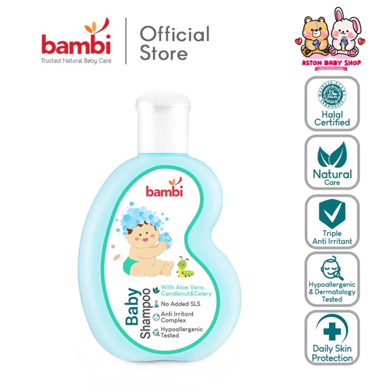 • Bambi Baby Shampoo diformulasikan secara khusus dari Aloe vera yang terbukti dapat membantu untuk mempercepat pertumbuhan rambut. Candlenut atau kemiri merupakan bahan alami untuk memperkuat akar rambut dan juga untuk menebalkan rambut. Dilengkapi dengan Celery (seledri) yang dipercaya untuk mecegah kerusakan rambut serta menebalkan rambut. Kombinasi dari ke tiga bahan ini secara efektif dapat menebalkan, merangsang pertumbuhan rambut juga menyehatkan rambut.