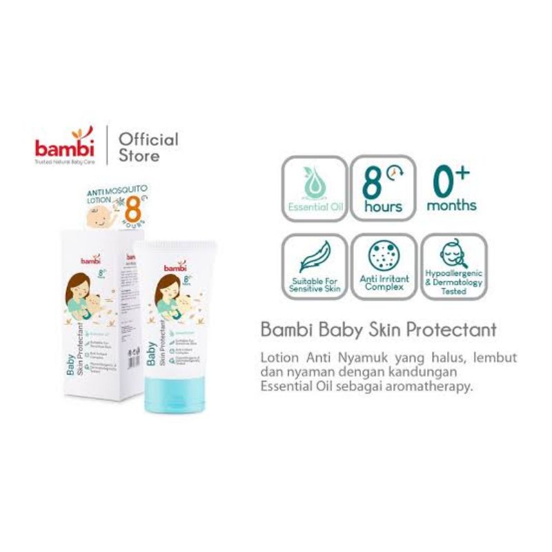 Bambi Baby Skin Protectant 50ml Lotion yang halus, lembut dan nyaman dengan kandungan Essential Oil sebagai aromatherapy yang dapat membuat bayi menjadi lebih relax dan tenang agar bayi bisa lebih cepat tidur. Berfungsi juga sebagai pengusir nyamuk, serta mengandung Panthenol dan Chamomile yang dapat membantu menjaga kulit sepanjang hari dan terlindung dari iritasi ringan.