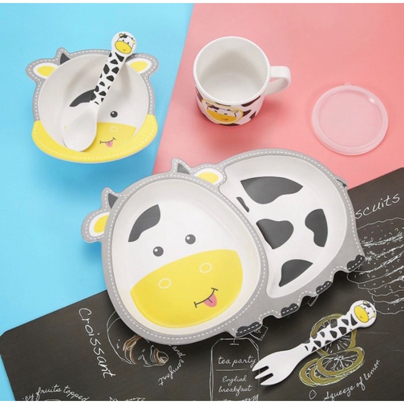 Bamboo Fiber Feeding Kids Set Cow / Peralatan Makan Bayi