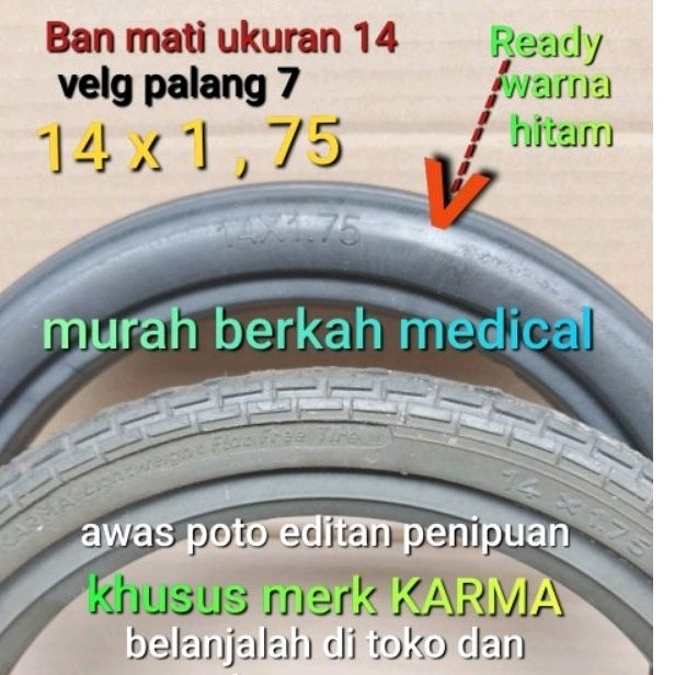 harga satuan bukan sepasang ready warna hitam hanya ban saja motif ban beda dari ban bawaannya ukuran 14 x 1 , 75 barang sesuai poto iklanya yang ada tanda panah nya Ban mati original untuk kursi roda merk KARMA VELG PALANG 7