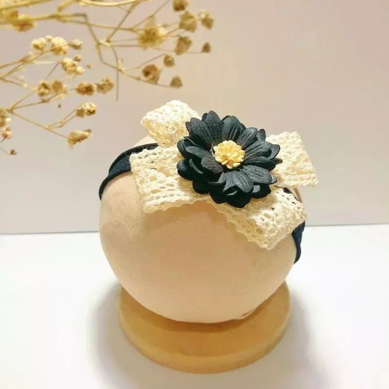 Ukuran bunga suede 4cm, di aplikasikan dengan pita vintage warna krem yang sangat cantik.