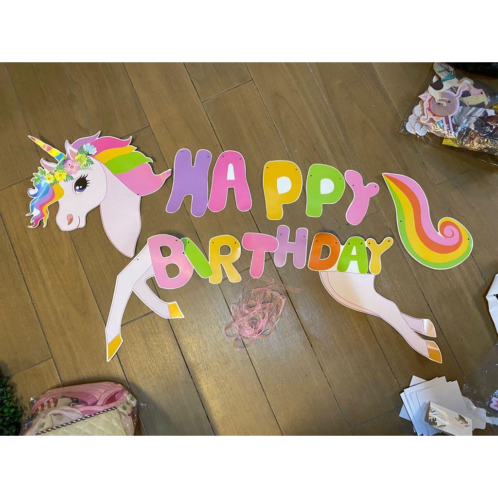 - 1 set banner ini terdiri dari 13 rangkaian huruf HAPPY BIRTHDAY tema UNICORN + 2 pc "KEPALA + EKOR UNICORN"