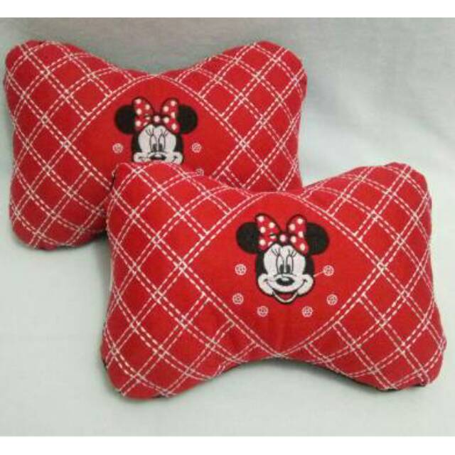 Bantal kepala untuk dimobil, motif Minnie Mouse merah, bordir